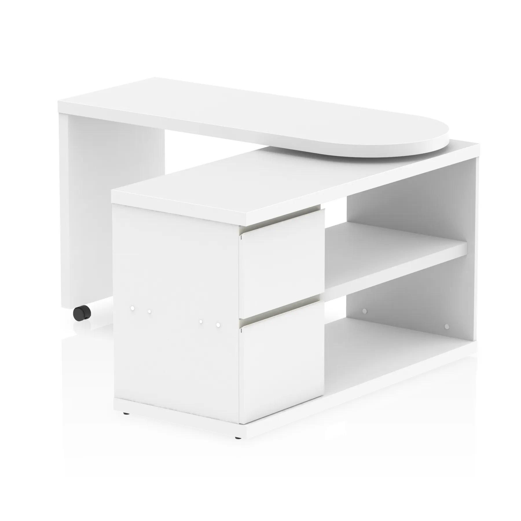• Comprehensive, all-in-one desk and storage system • Desk top easily and conveniently stows away over shelves when not in use • 360 ° rotating, castor mounted desktop • Dual extra large drawers • Two fixed shelves • Substantial 40mm thick desktop • Can be assembled either Left or Right handed formations • Foolscap filing rails on bottom drawer • Available in Grey Oak or White finishes • Weight Capacity: Desk – 100Kg; Drawers & Shelves – 15Kg