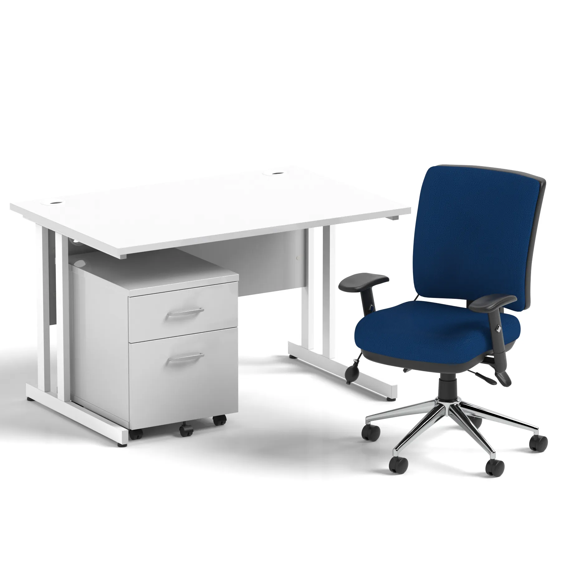 Impulse contract desk | 25mm tops | Heat resistant melamine finish | 18mm modesty panel | Double strut legs | Steel to steel fixings | Impulse mobile pedestal | Steel handles | Smooth running castors for mobility | Lockable drawers | Solid drawer construction | Chiro medium chair | Posture chair UK Chiropractic Doctor approved | Height adjustable back and seat | Pump lumbar support | Triple lever independent mechanism | Independent seat and backrest tilt angle adjustment | Gas lift tested up to 150kg | Usage: Task 24/7