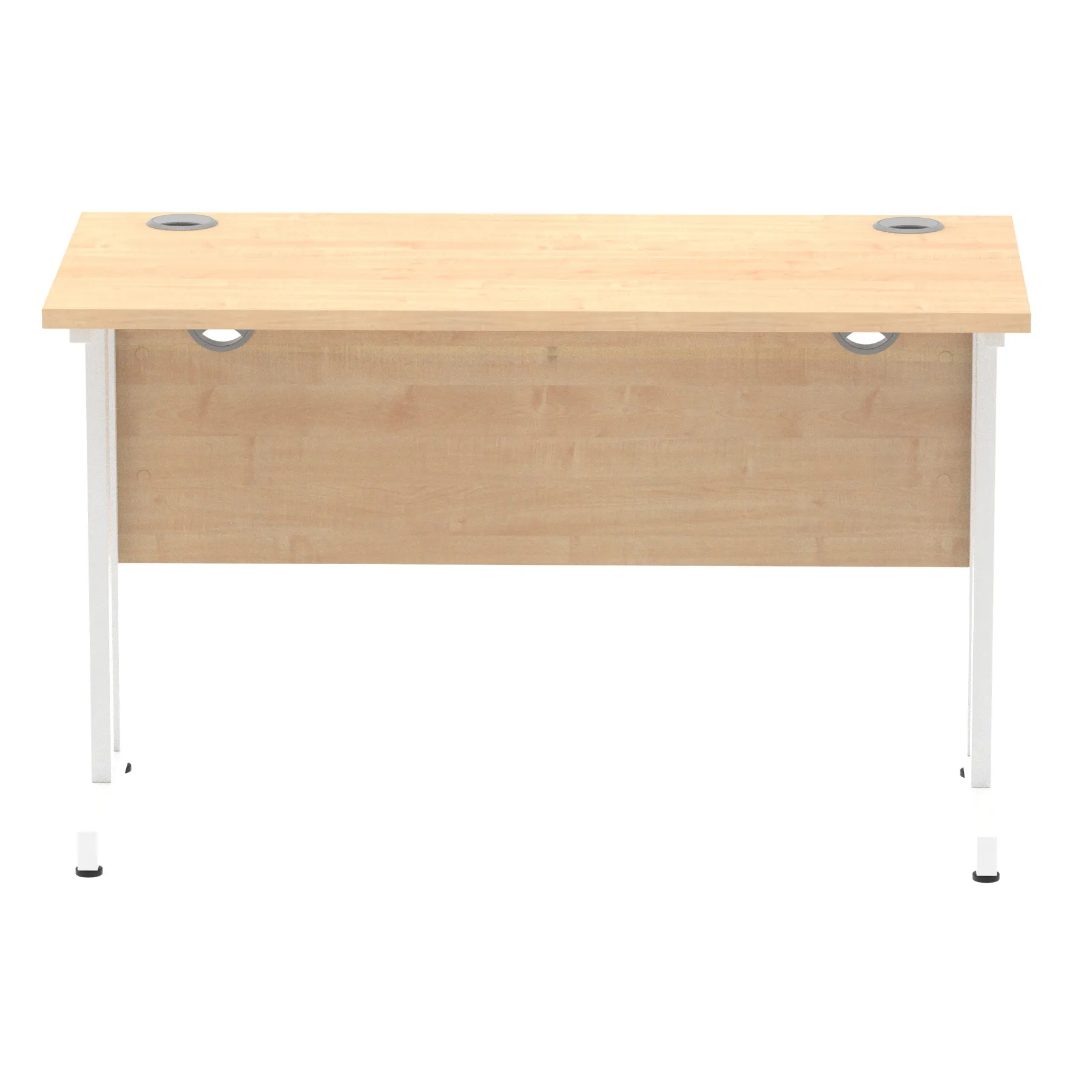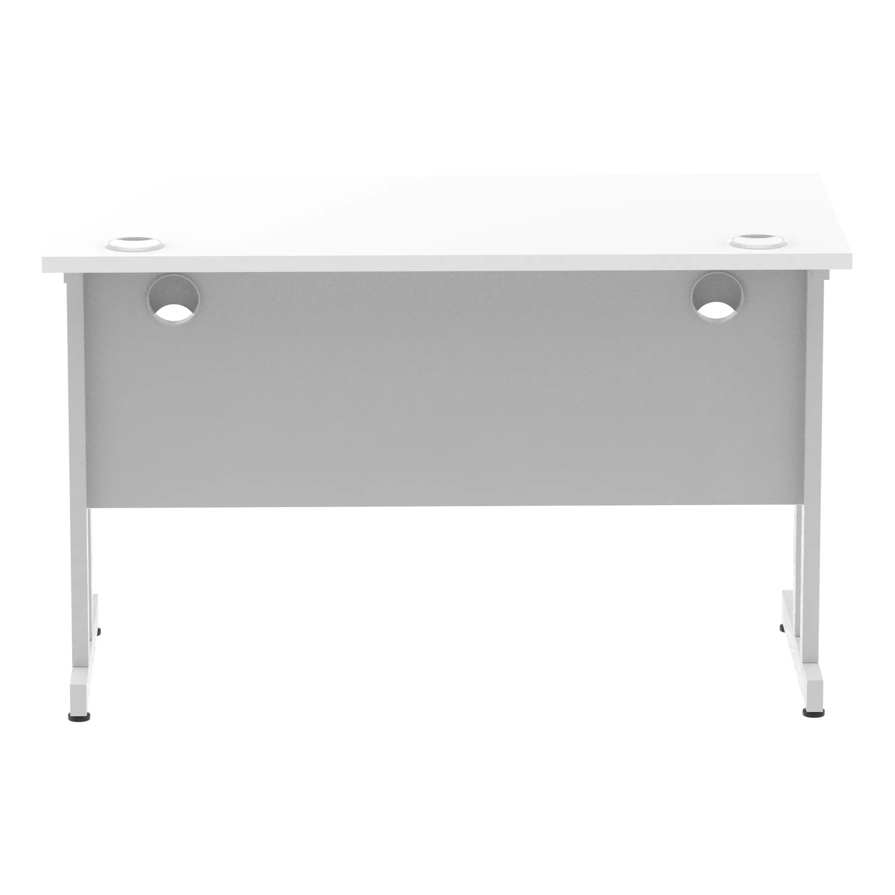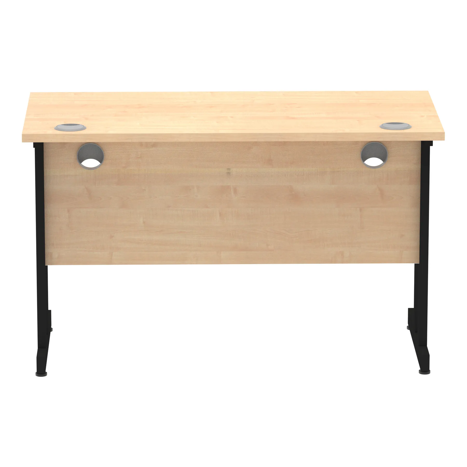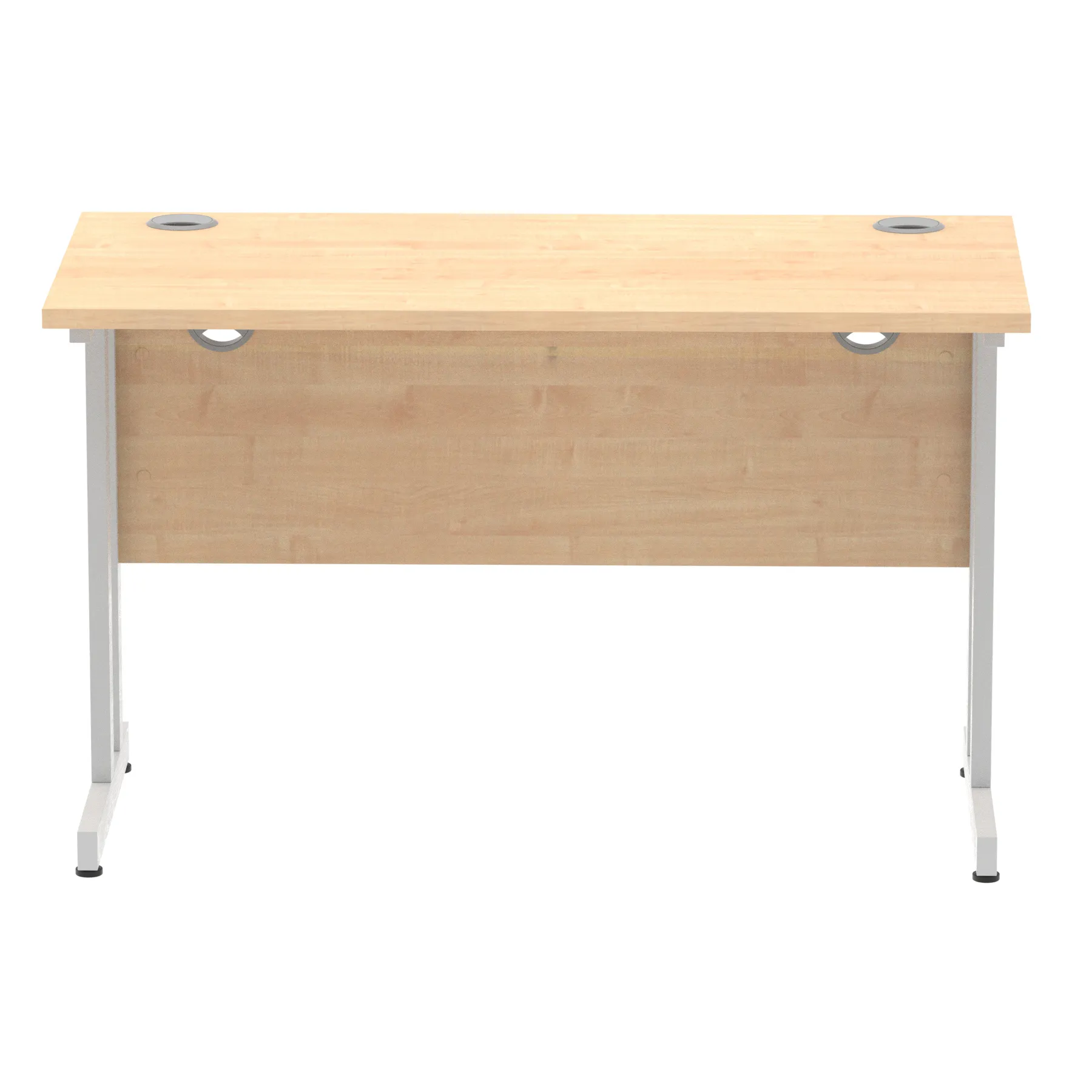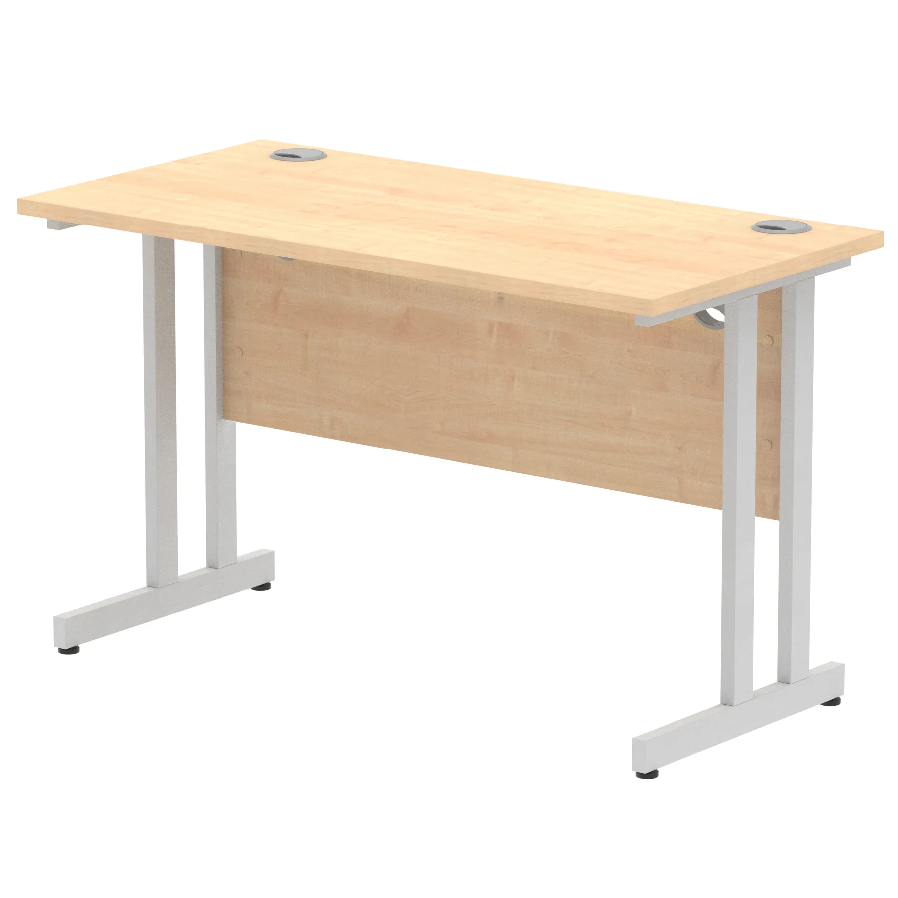 Impulse contract desk | 25mm tops | Heat resistant melamine finish | 18mm modesty panels | 2mm protective abs edging | Silver coated double strut legs | 2 cable ports | Height adjustable feet | Steel to steel fixings | 2 modesty panels slots| Deep set modesty panel (5″) allows for compatibility of most screen clamp fittings | Weight Capacity 135Kg