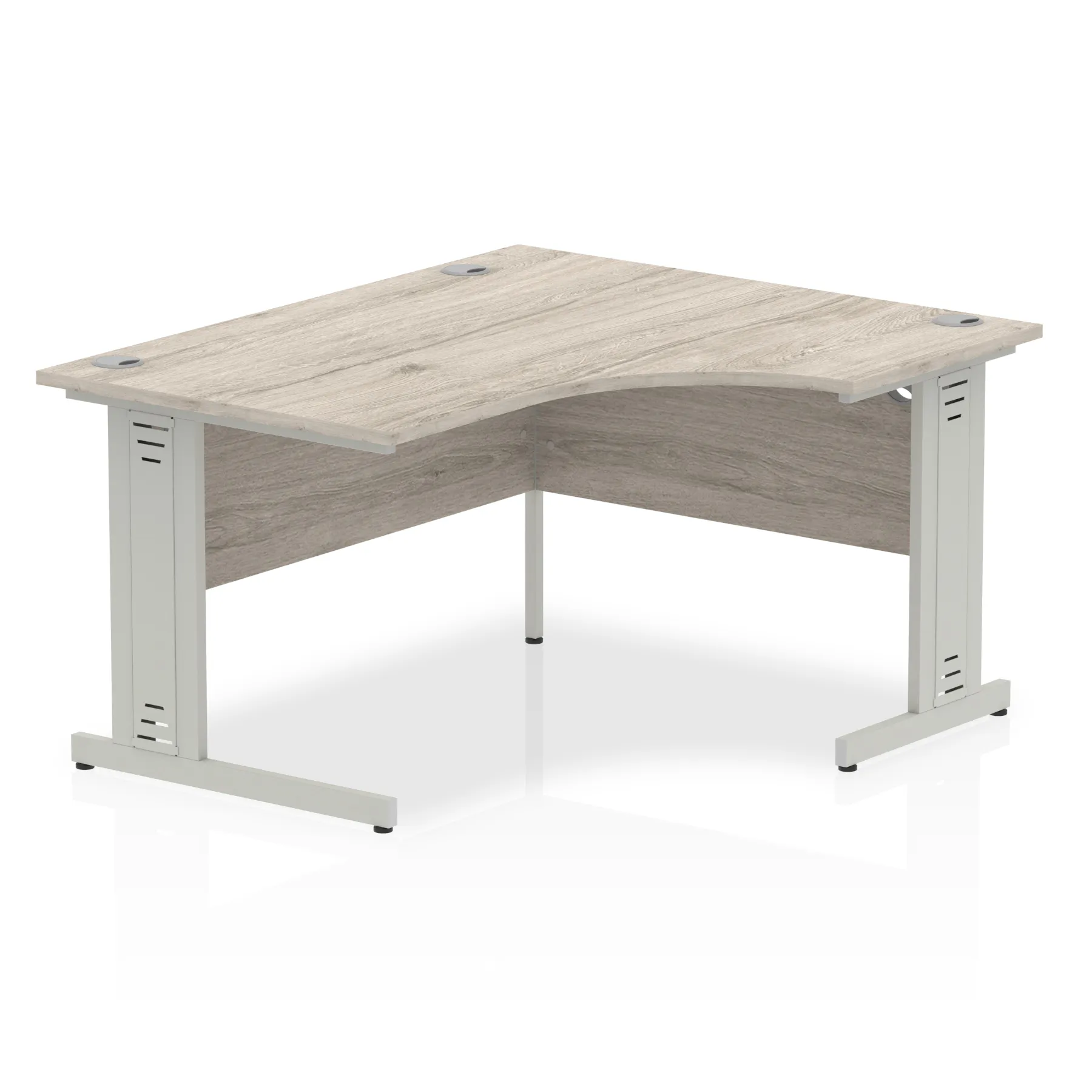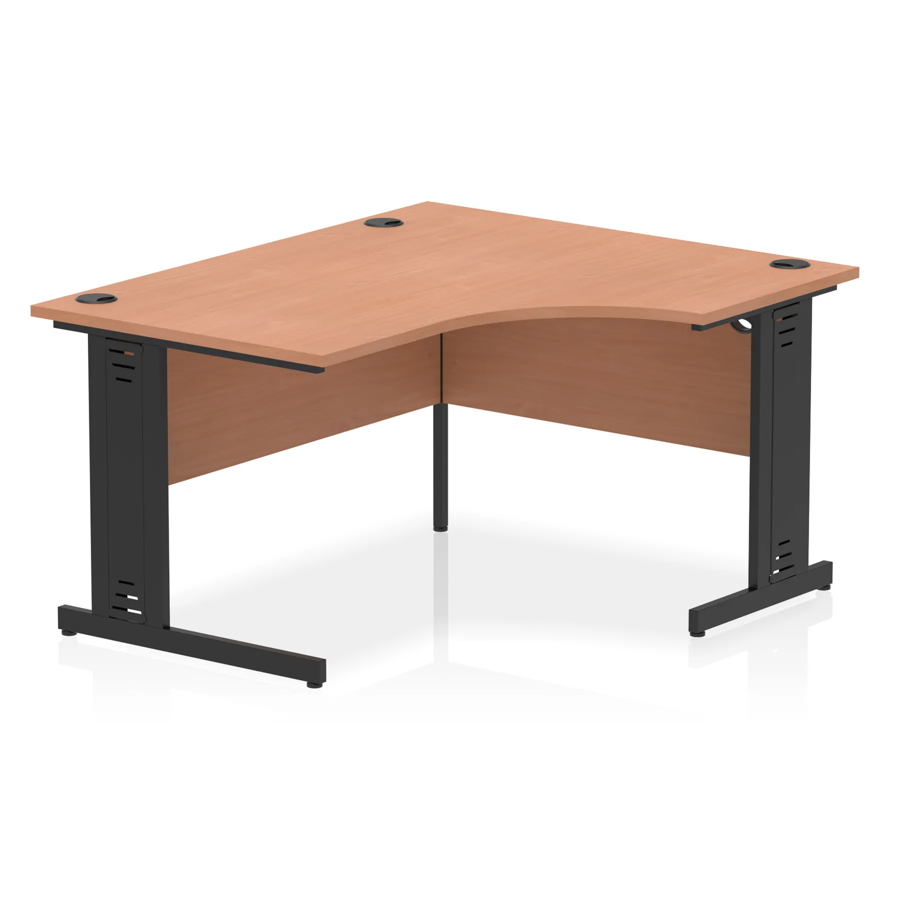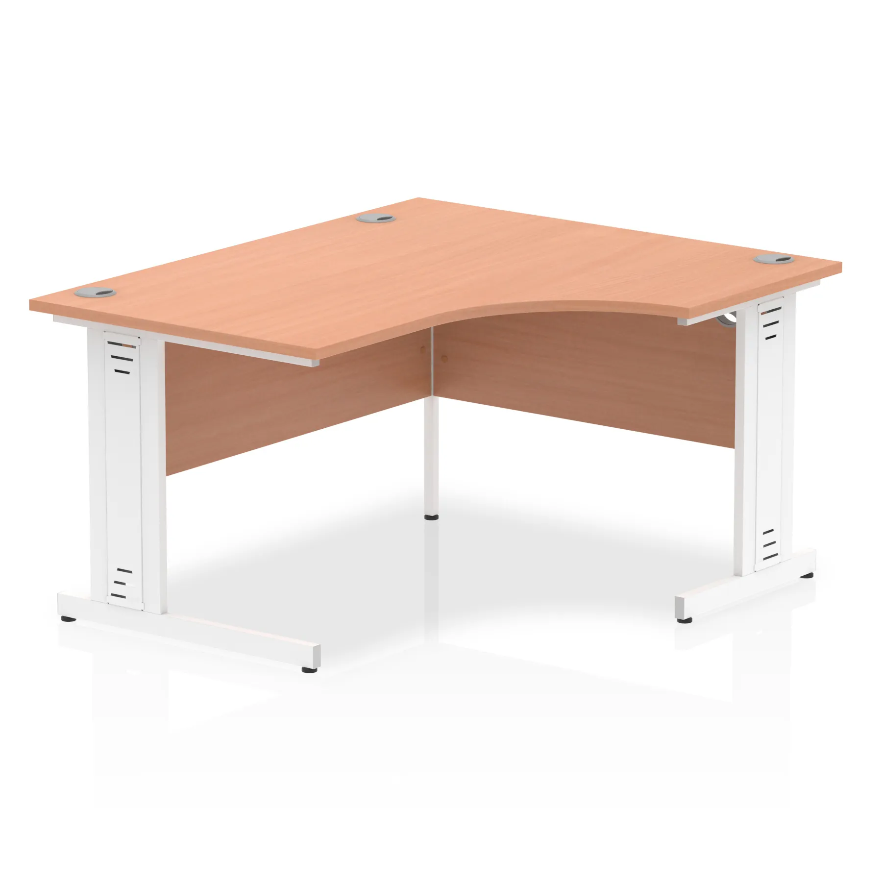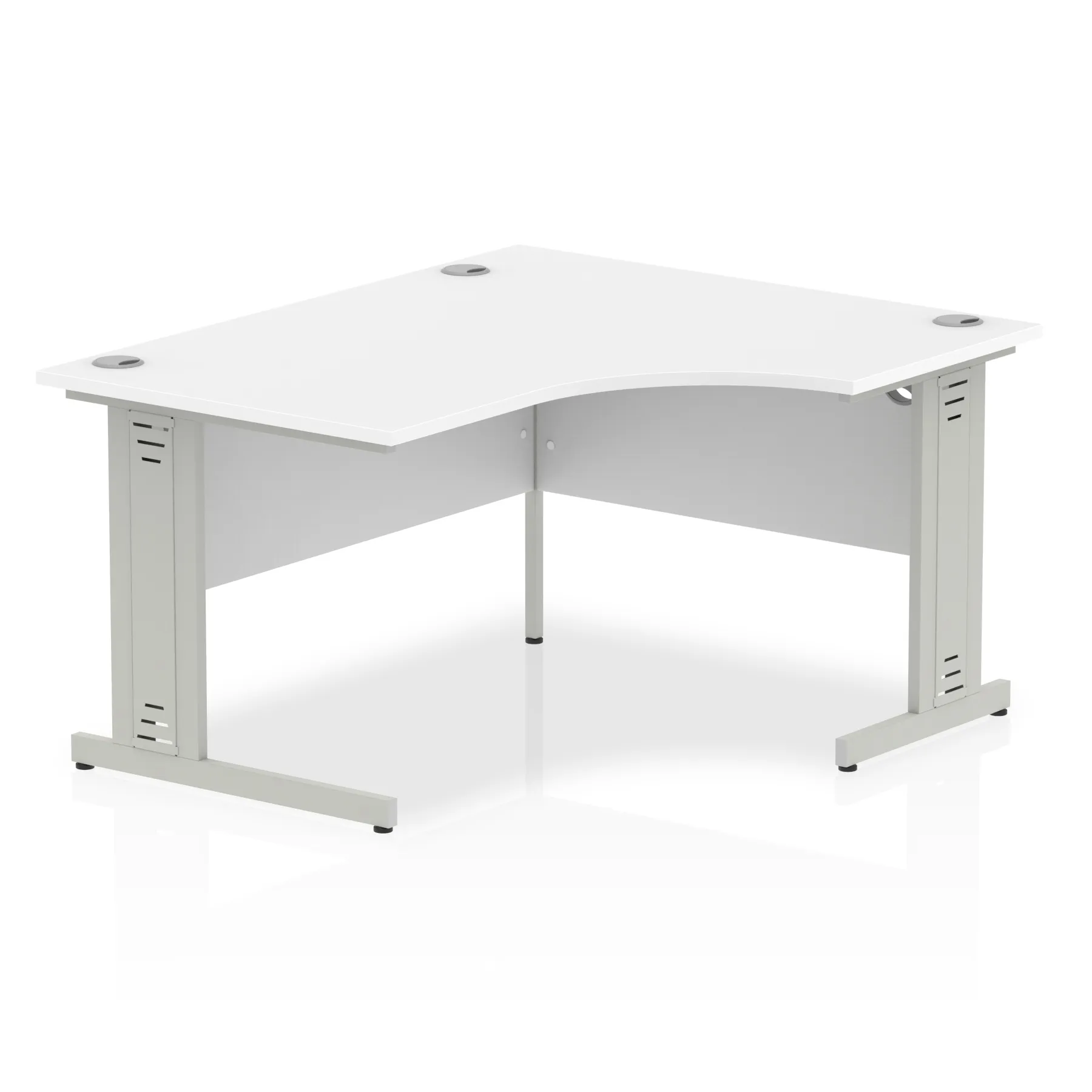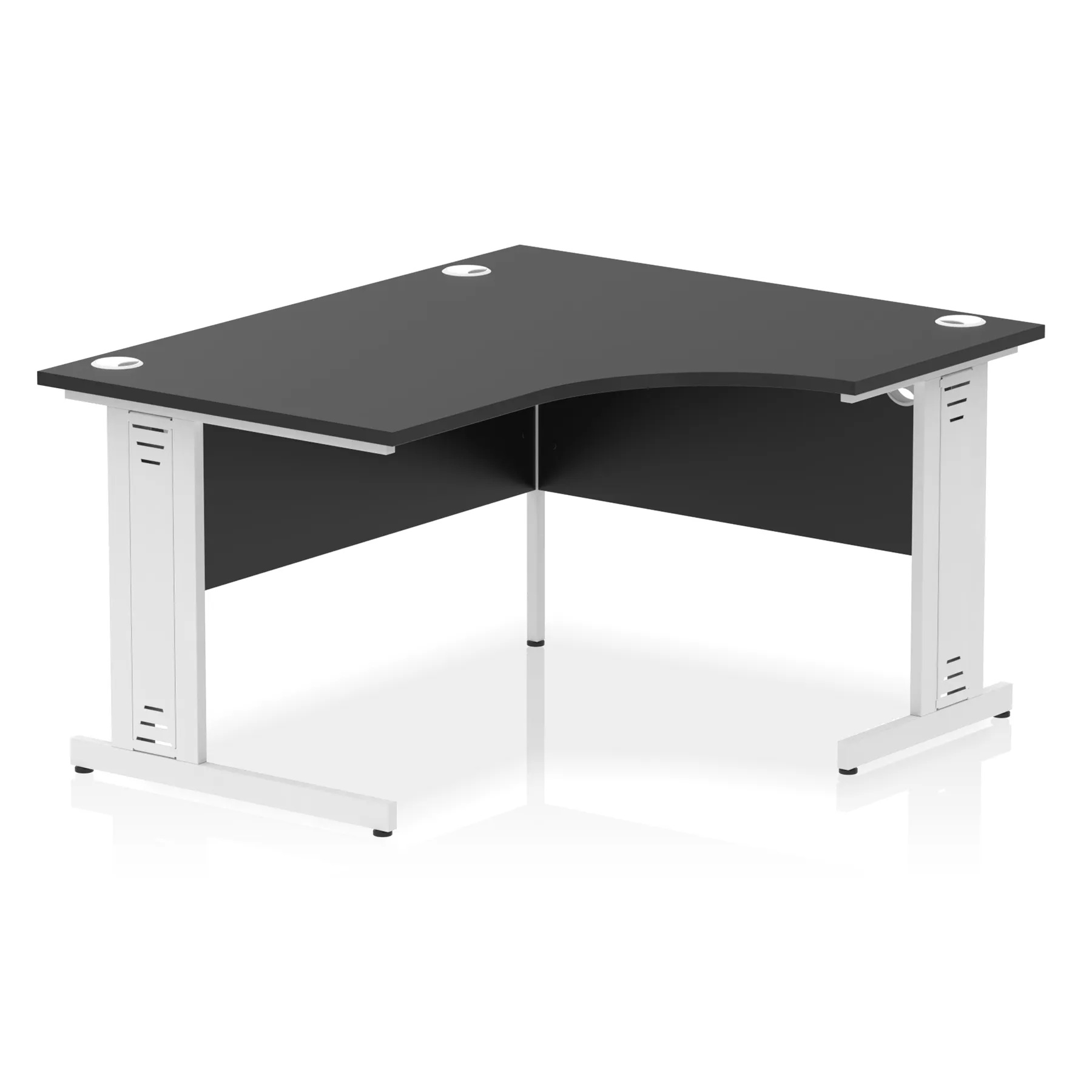• Impulse contract 1400 wide crescent desk • 25mm tops • Heat resistant melamine finish • 18mm modesty panels • 2mm protective abs edging • Double strut legs • 3 cable ports • Height adjustable feet • Steel to steel fixings • 3 modesty panels slots • 600 deep • Deep set modesty panel (5″) allows for compatibility of most screen clamp fittings • Weight Capacity: 135Kg