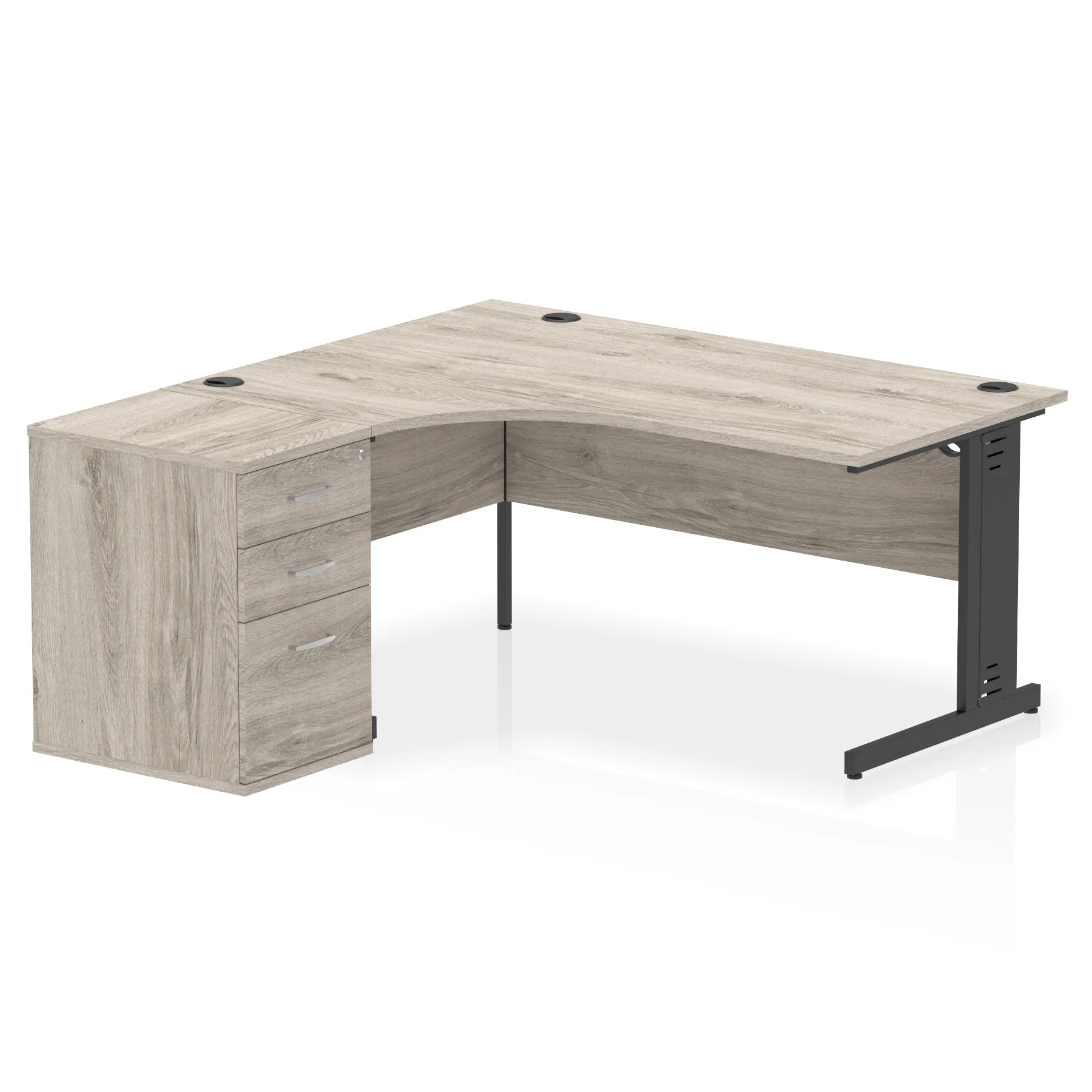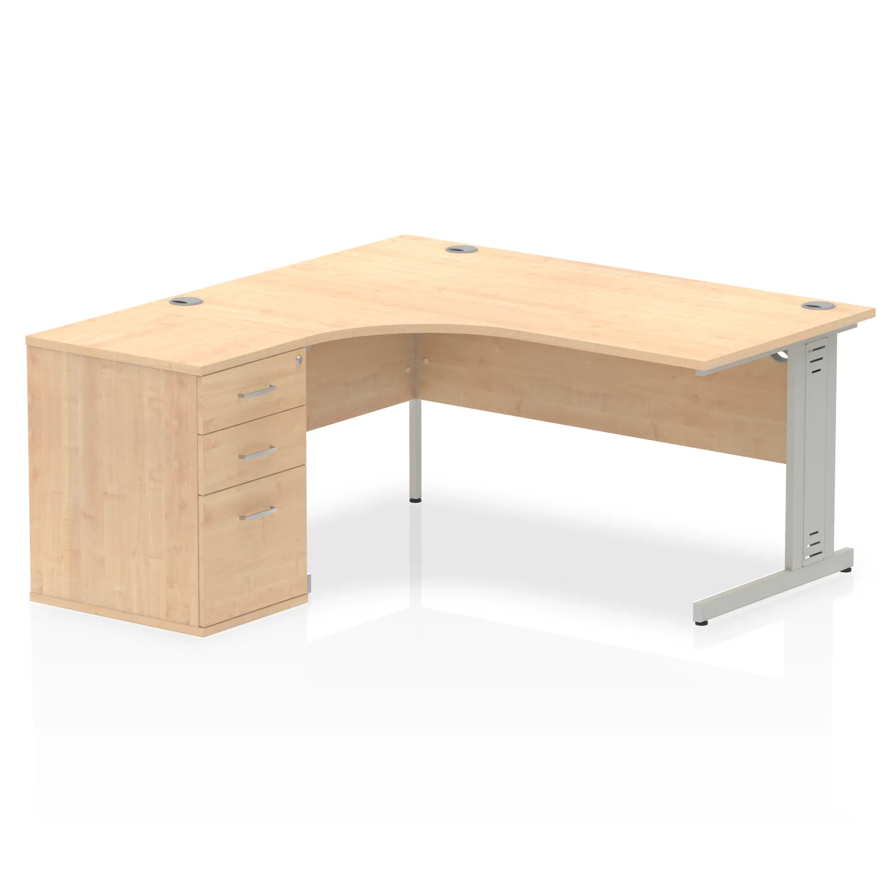 • Impulse contract workstation • 25mm tops • Desk and pedestal combined • Heat resistant melamine finish • 18mm modesty panel • 2mm protective abs edging • Double strut legs • Multiple cable ports • Height adjustable feet • Steel to steel fixings • Modesty panel slots wire slots • Deep set modesty panel (5″) allows for compatibility of most screen clamp fittings