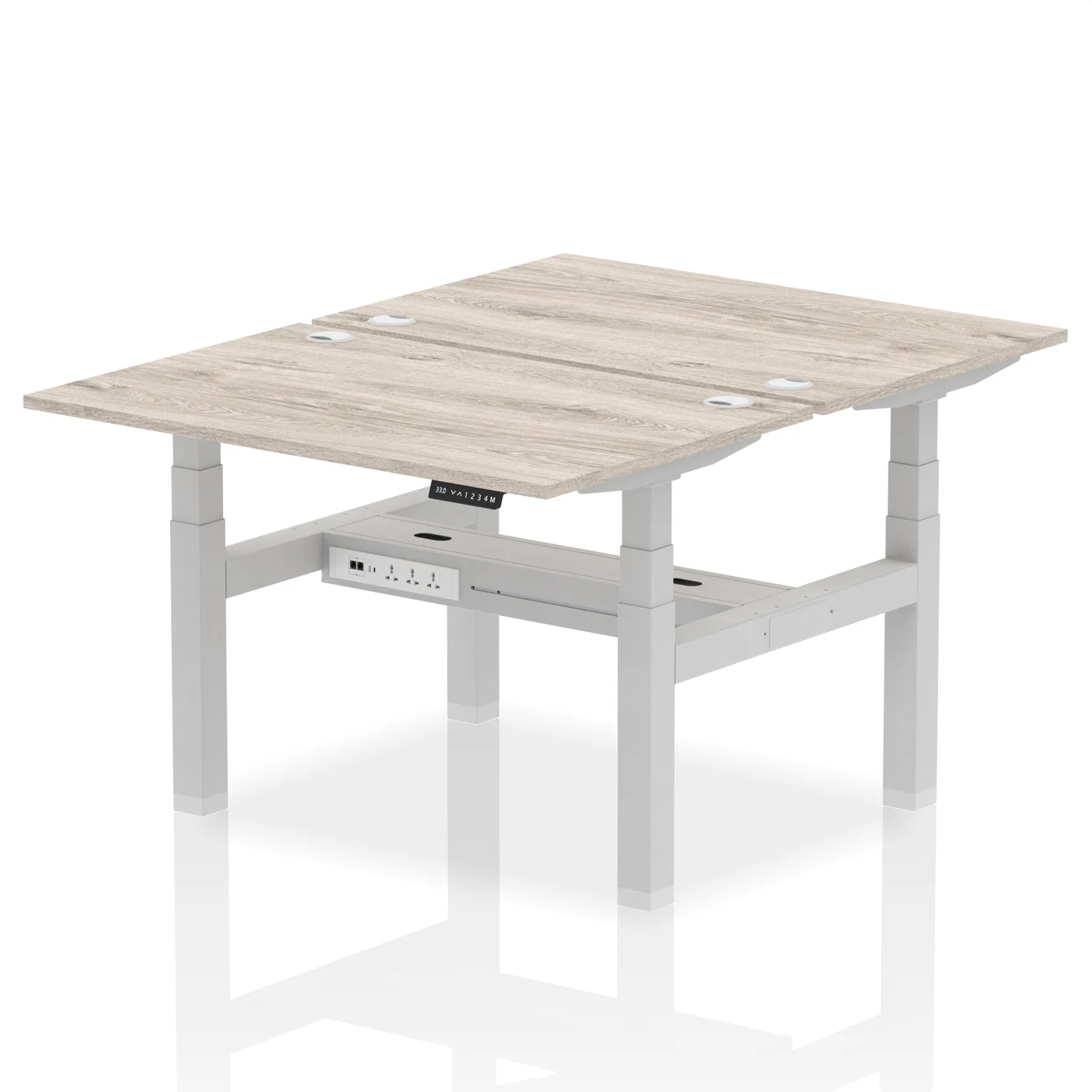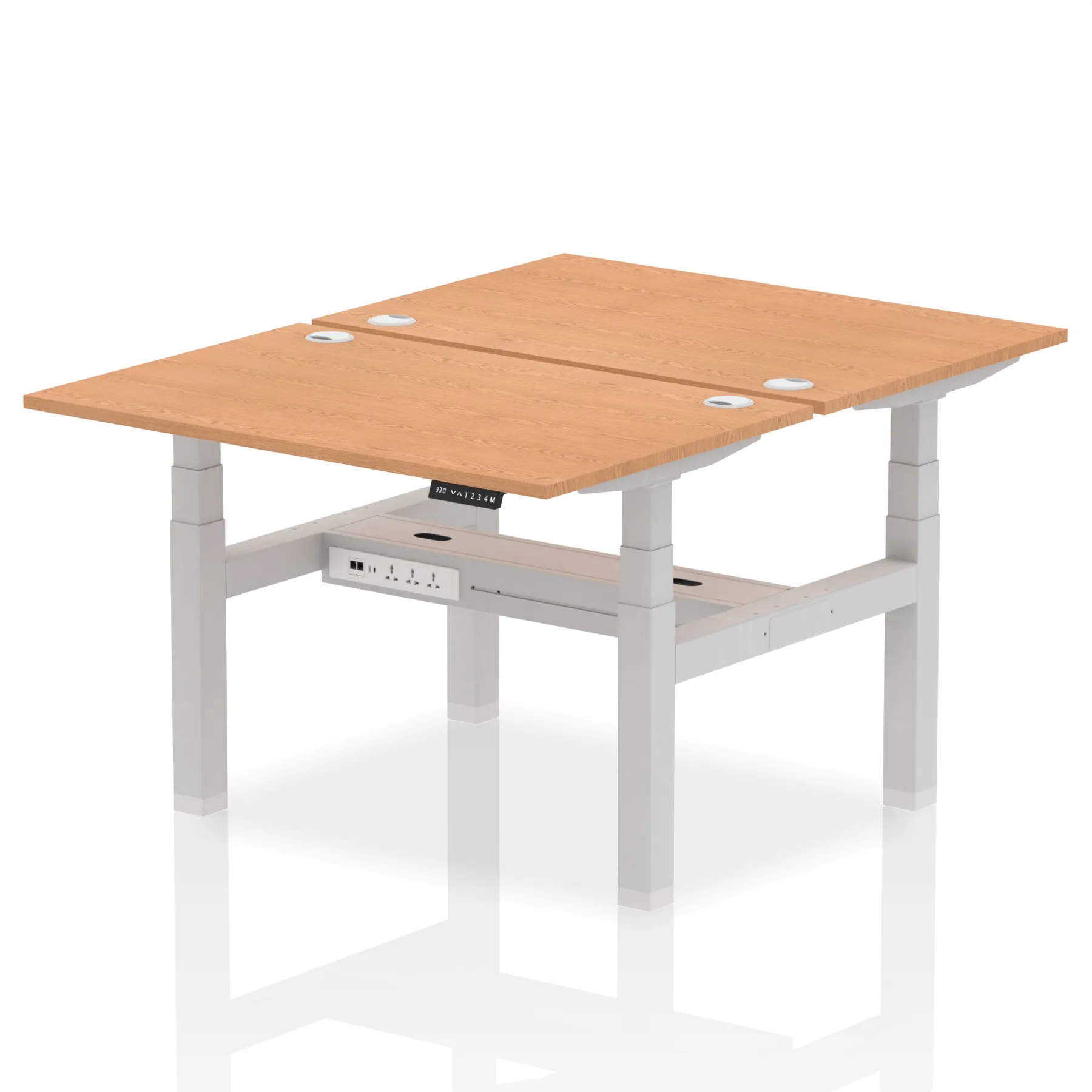 The Air Back-to-Back Height Adjustable Desk, designed for two, is the epitome of efficiency and connectivity. Each desk comes equipped with two Ethernet ports, a USB port, a USB-C port, and three UK plugs, catering to all digital needs. Integrated cable ports ensure a tidy workspace. Adjustable height options offer ergonomic comfort. This desk is the ultimate solution for teams seeking a connected, efficient, and adaptable workspace.