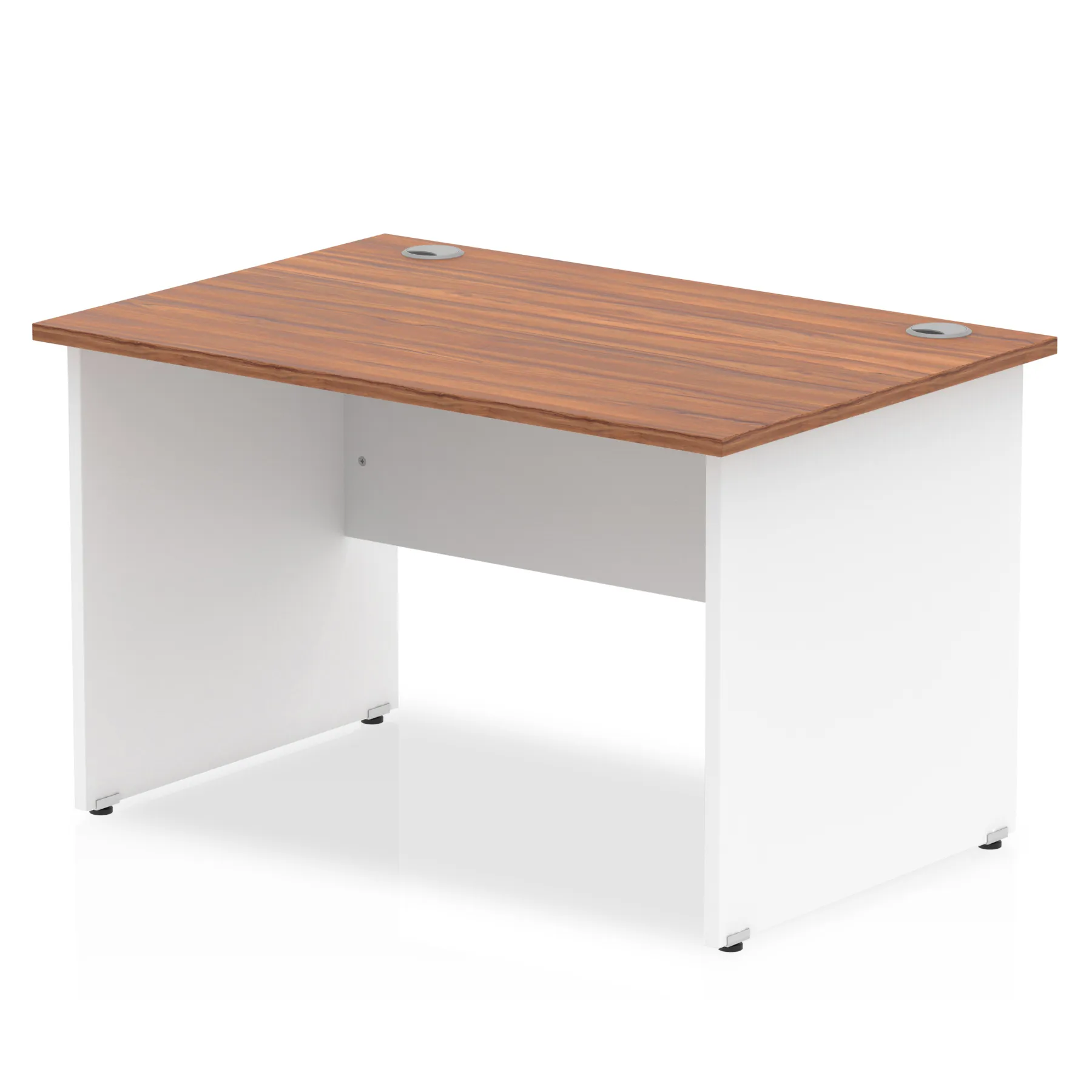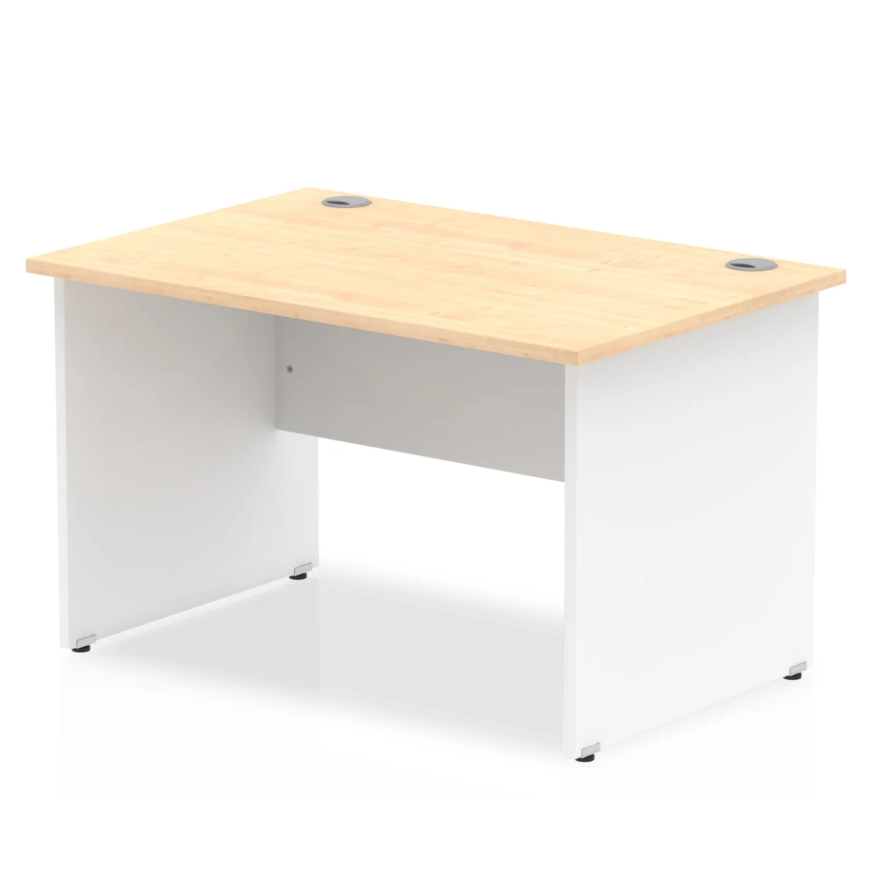 Impulse contract desk | 25mm tops | Heat resistant melamine finish | 18mm modesty panel | 2mm protective abs edging | Matching wood panel end legs | 2 cable ports | Height adjustable feet | Steel to steel fixings | 2 modesty panel slots | Deep set modesty panel (5″) allows for compatibility of most screen clamp fittings | Weight Capacity 135Kg