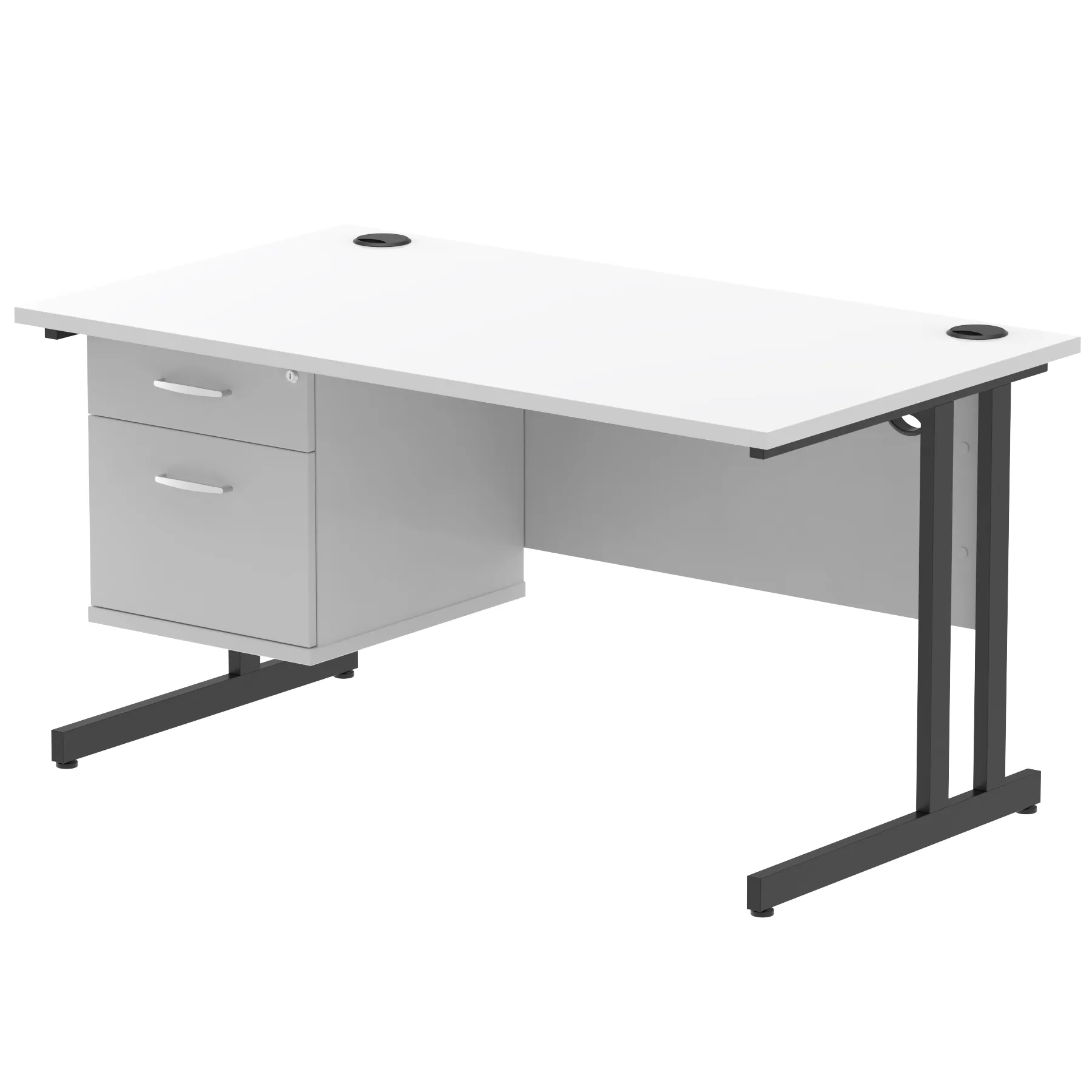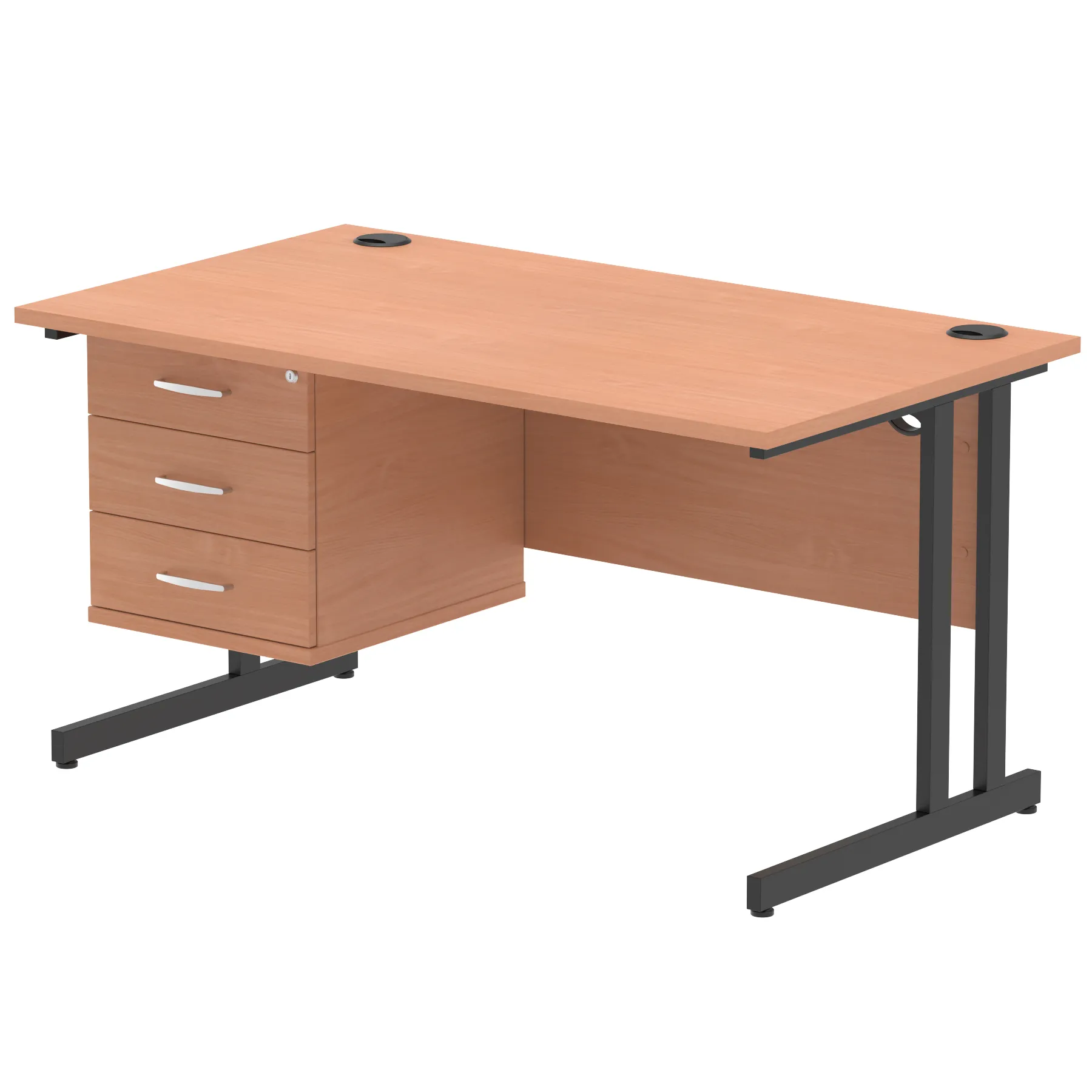 • Impulse contract 1400 wide desk • 25mm tops • Heat resistant Beech melamine finish • 18mm modesty panels • 2mm protective abs edging • White coated double strut legs • 2 cable ports • Height adjustable feet • Steel to steel fixings • 2 modesty panels slots • Deep set modesty panel (5”) allows for compatibility of most screen clamp fittings • Fixed pedestal