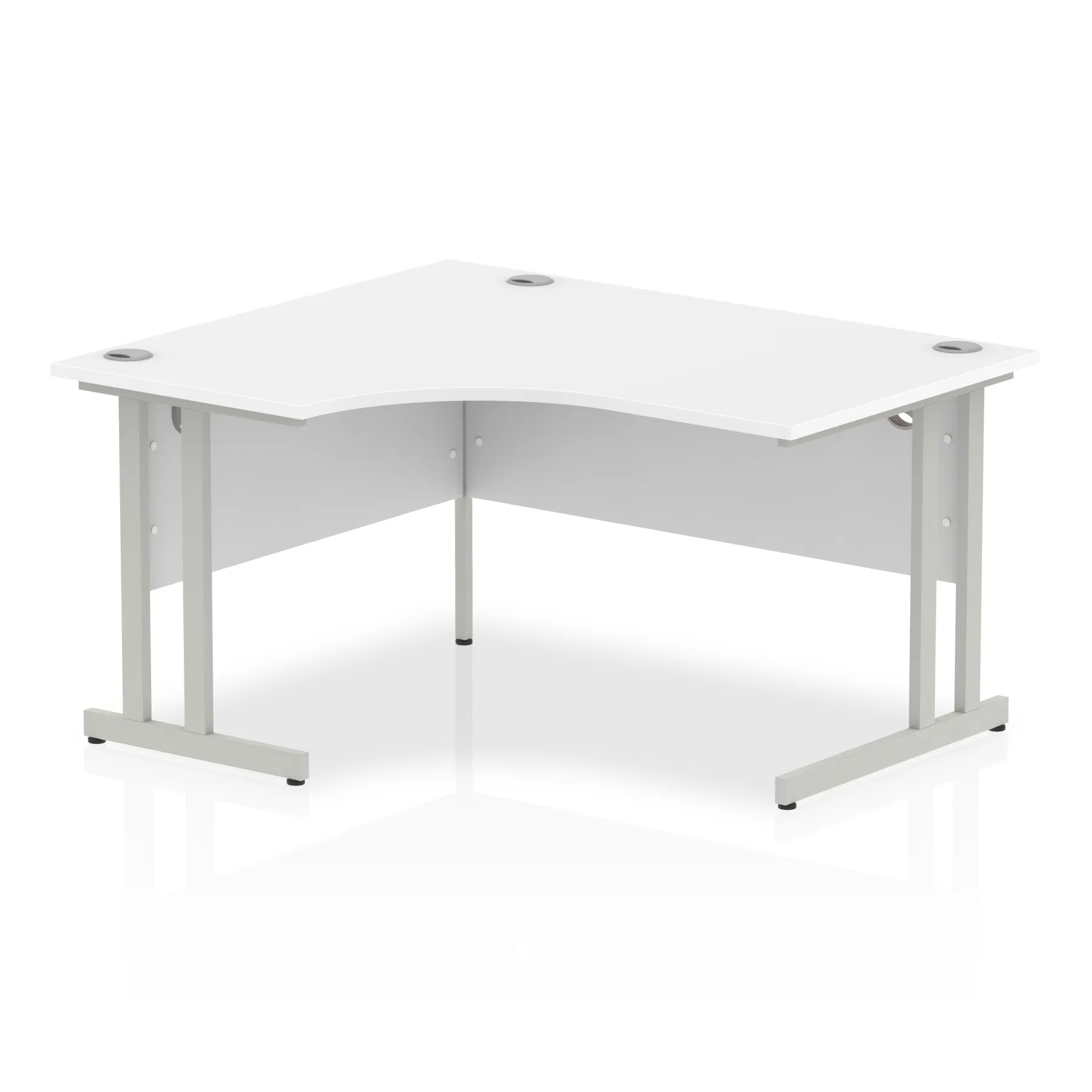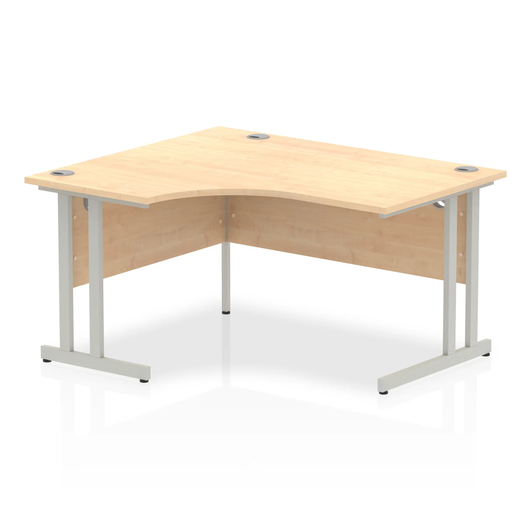 Impulse contract 1400 wide crescent desk | 25mm tops | Heat resistant beech melamine finish | 18mm modesty panels | 2mm protective abs edging | Silver coated double strut legs | 3 cable ports | Height adjustable feet | Steel to steel fixings | 3 modesty panels slots | 600 deep | Deep set modesty panel (5″) allows for compatibility of most screen clamp fittings | Weight Capacity 100Kg