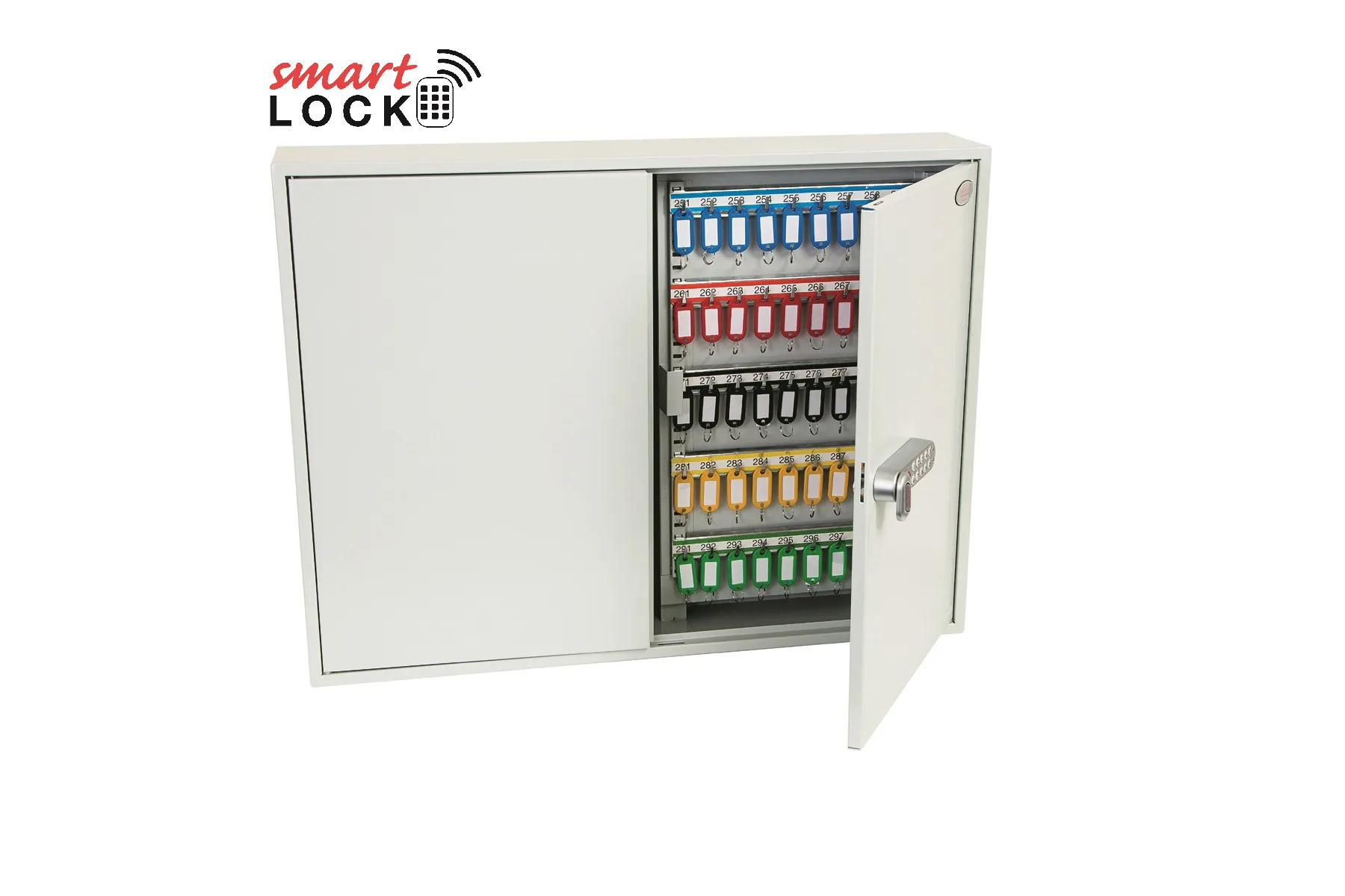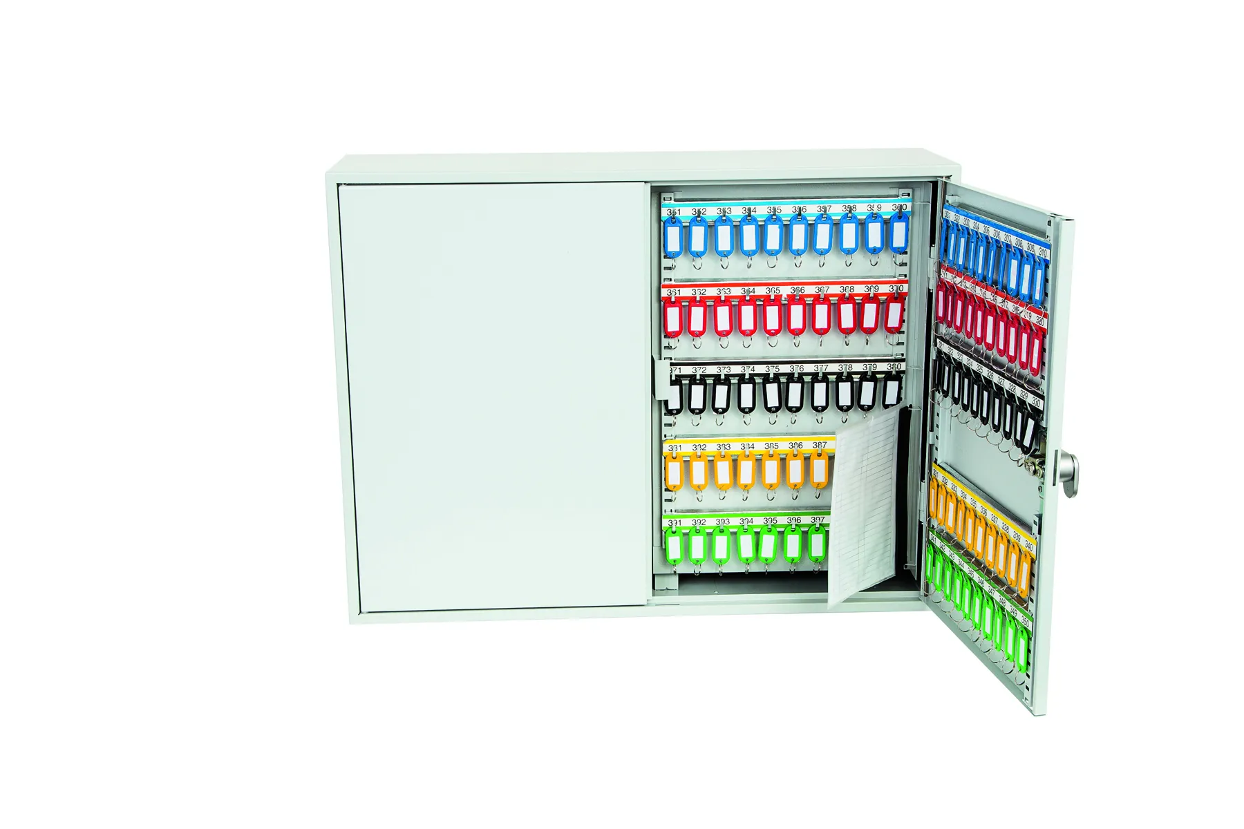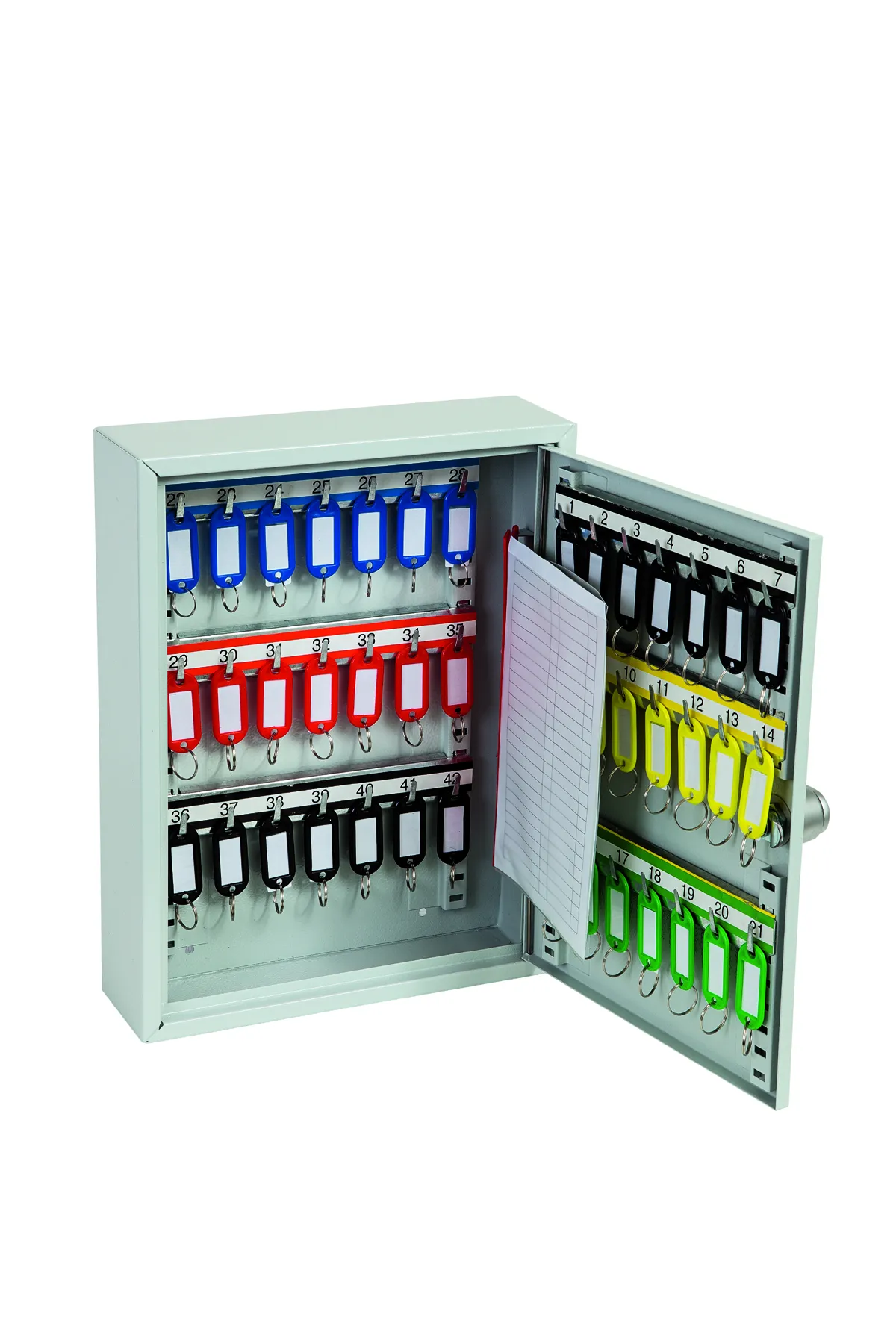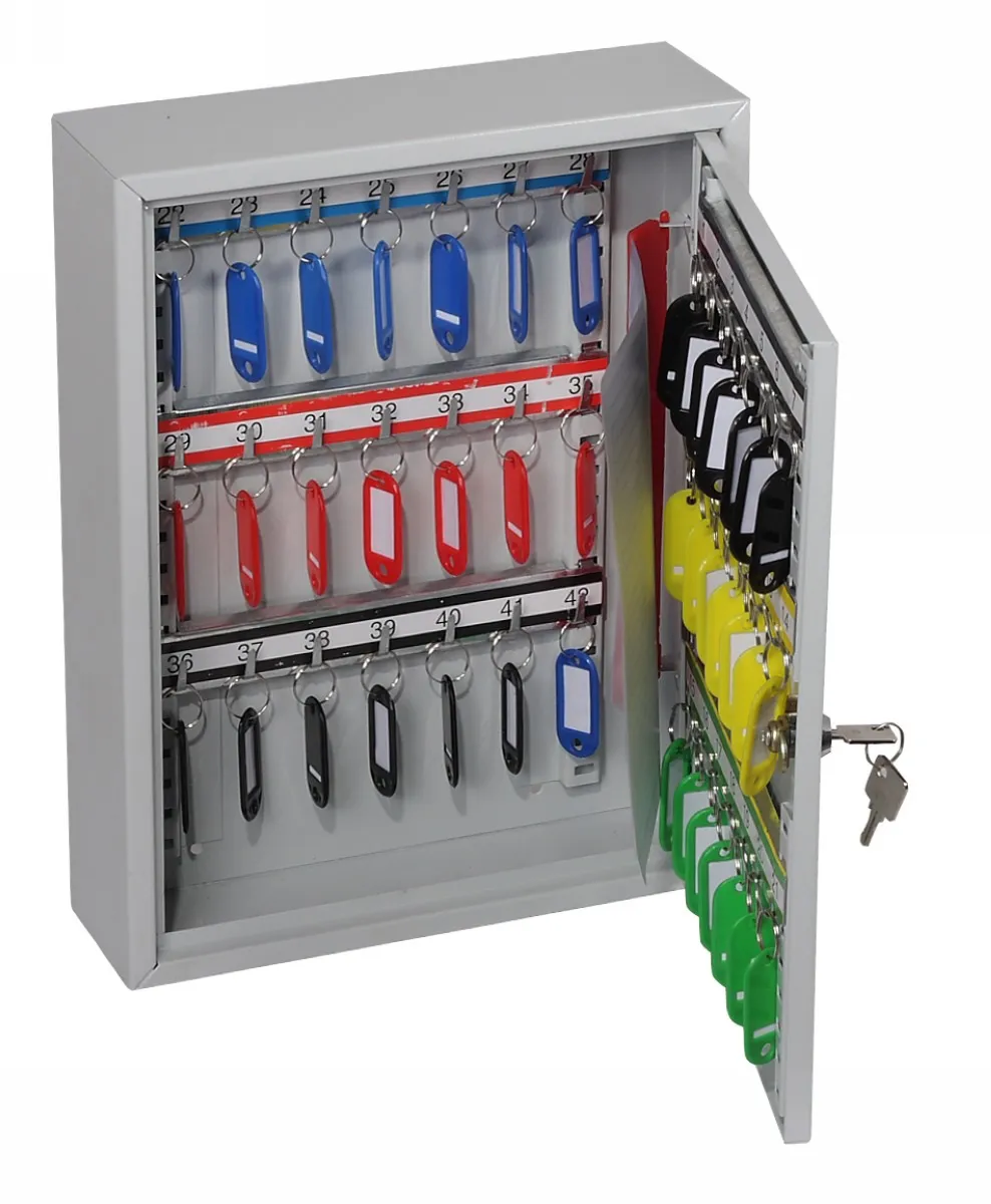 NO. OF KEY HOOKS – 42, 64, 100, 200, 300, 400 or 600 | SPECIAL FEATURES – Each unit comes with adjustable hook bars and number labels to suit. | FIXING – The cabinets have pre-drilled fixing holes for wall mounting and bolts supplied | FINISH – Finished in a high quality durable powder coated finish