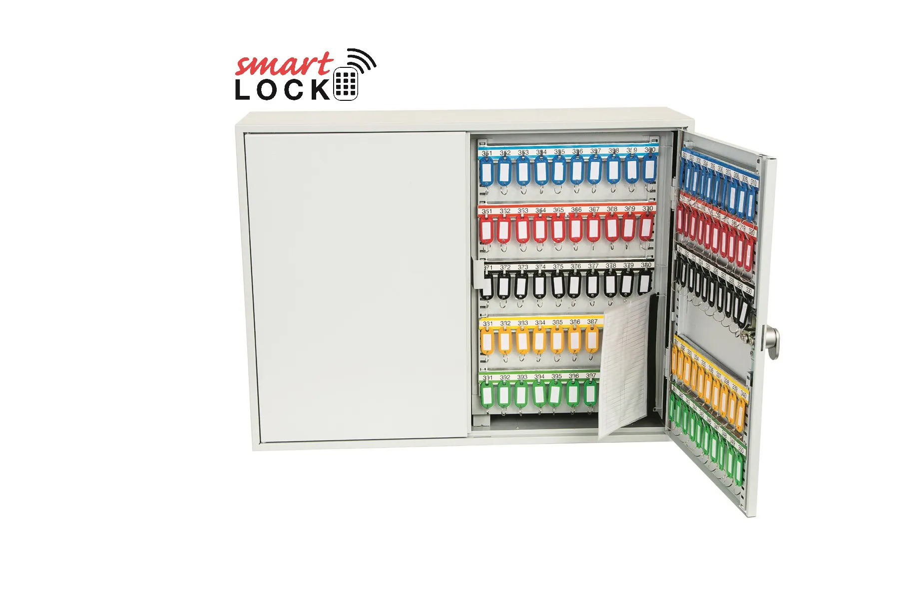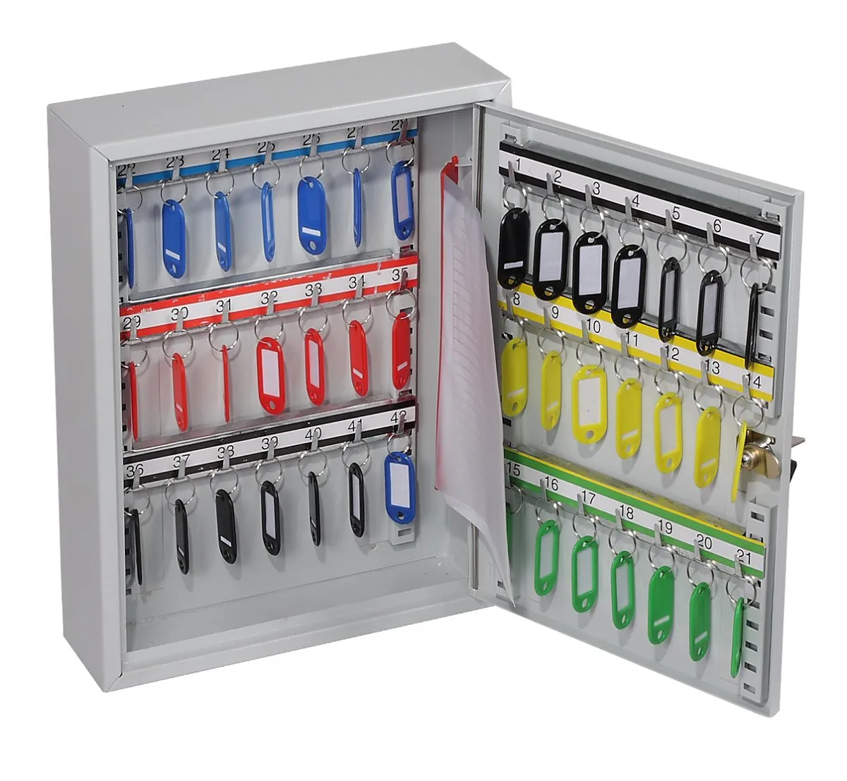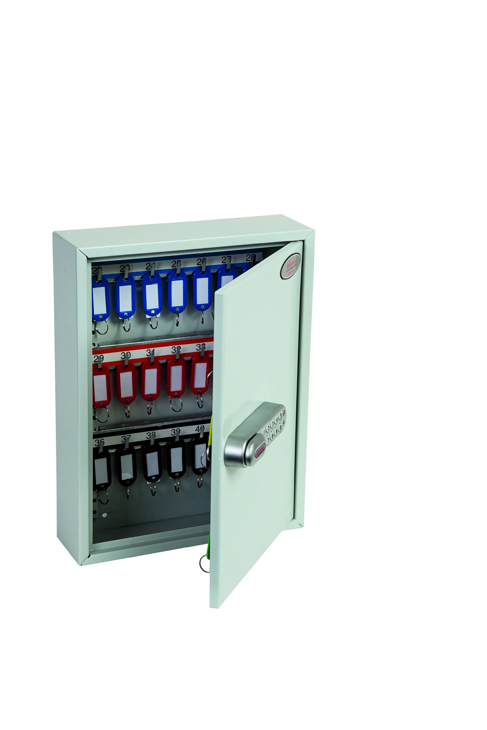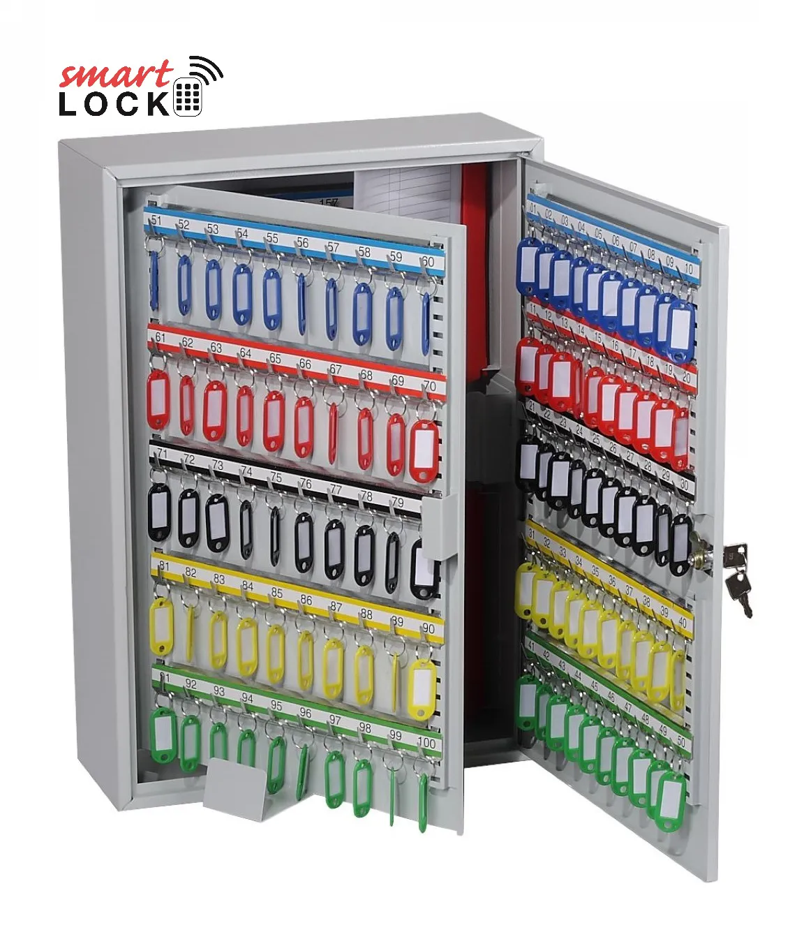 NO. OF KEY HOOKS – 42, 64, 100, 200, 300, 400 or 600 | SPECIAL FEATURES – Each unit comes with adjustable hook bars and number labels to suit. | FIXING – The cabinets have pre-drilled fixing holes for wall mounting and bolts supplied | FINISH – Finished in a high quality durable powder coated finish
